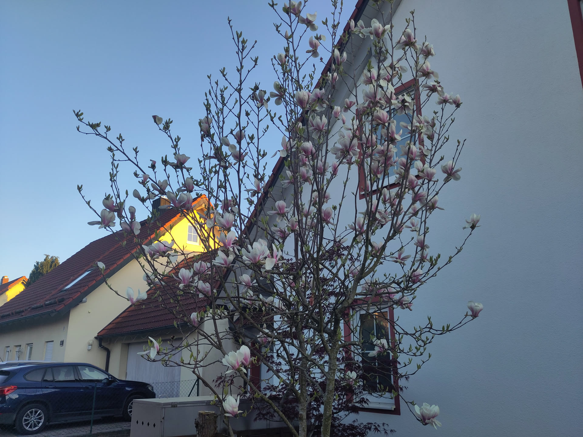 One of our proximite neighbours has a magnolia (thanks to my wife I now know what tree* that is) in her garden. I really like the flowers there. Super picturesque, which is why I took the picture!