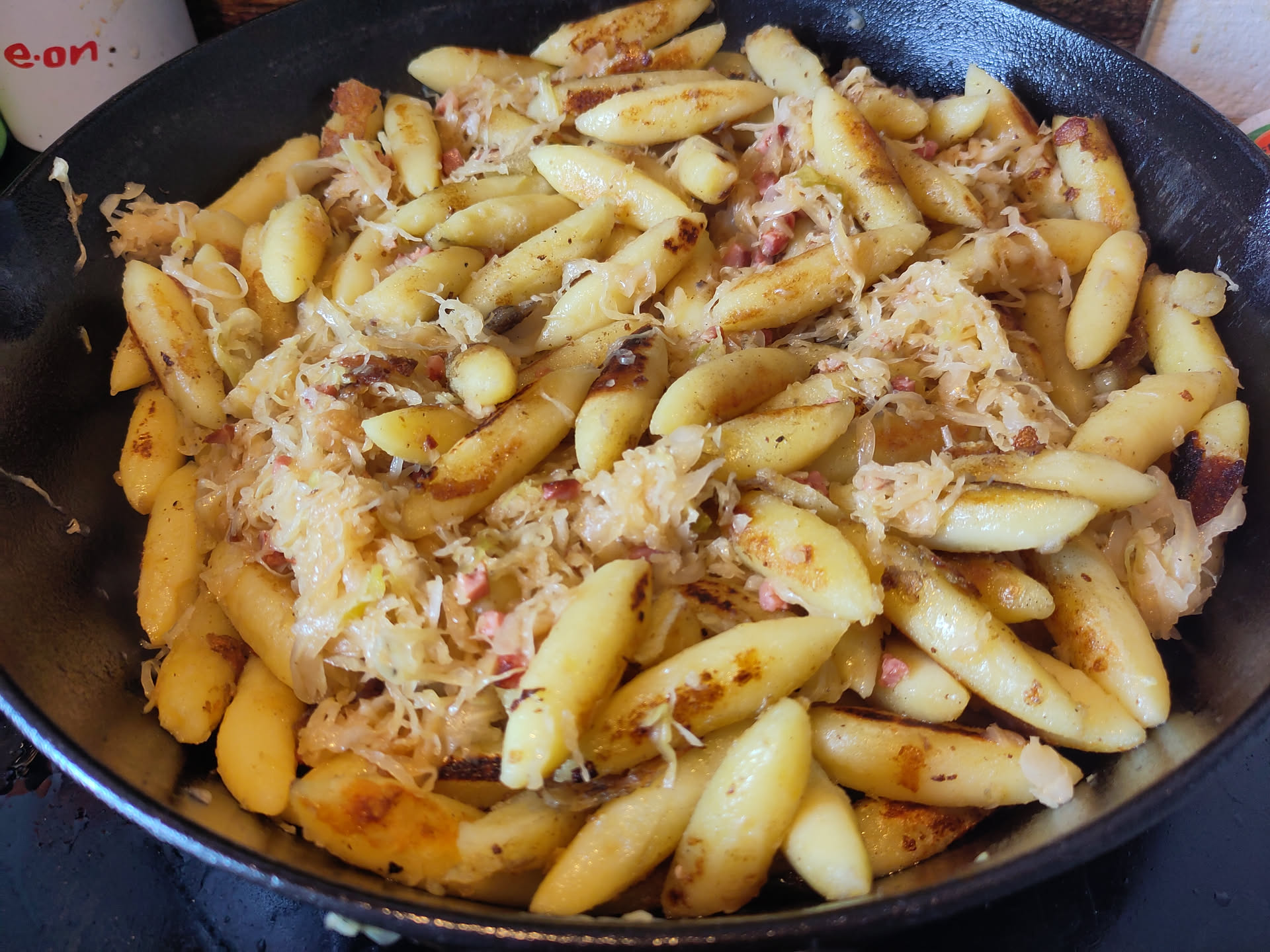 Finally, we ordered a cast iron pan for the LARP (although I eyed cast iron tools occasionally anyway). It's sooooo globdamn heavy at 3,3 kg and a very short handle. Like, literally, there's almost no buffer when I wrap my handle around. My fist is something like 8 cm long (or do you say "tall"?) and the handle has maybe a centimeter left that isn't covered by my grip. But frying food in it works really well after I "burned it in" and built up the protective patina. And since iron has such a low thermal conductivity, it retains the heat incredibly well. We usually make enough food to get two plates per person and the food is still almost as hot as fresh from the stove by the time we grab seconds. Buuut that comes with the detriment that heating up the pan in the first place takes much longer than with stainless steel or teflon pans.